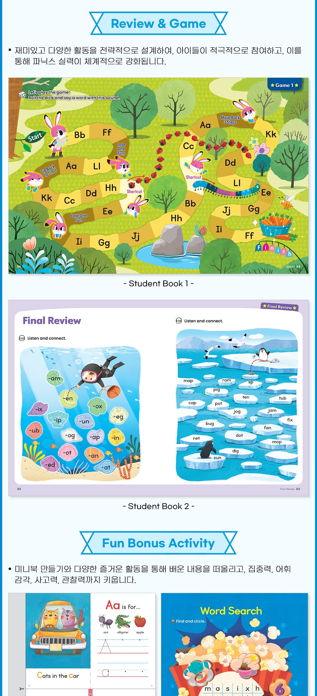 재미있고 다양한 Review & Game 활동을 전략적으로 설계하여, 아이들이 적극적으로 참여하고, 이를 통해 파닉스 실력이 체계적으로 강화됩니다.