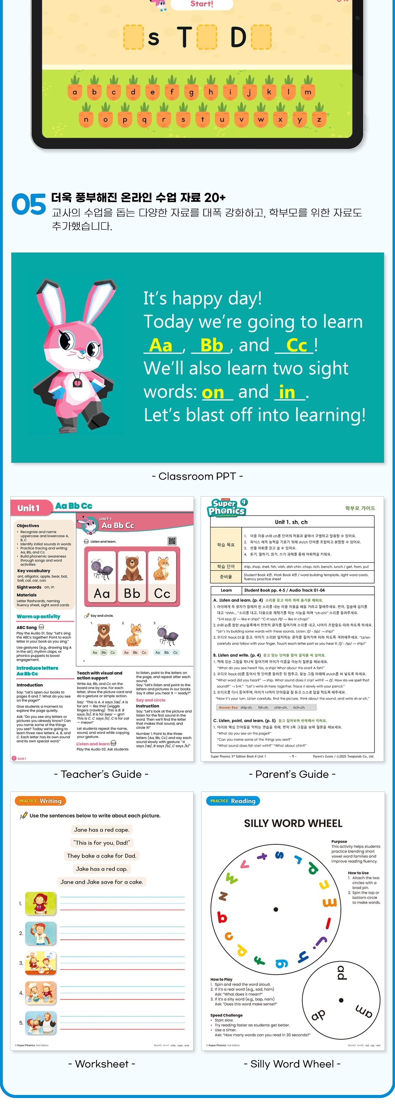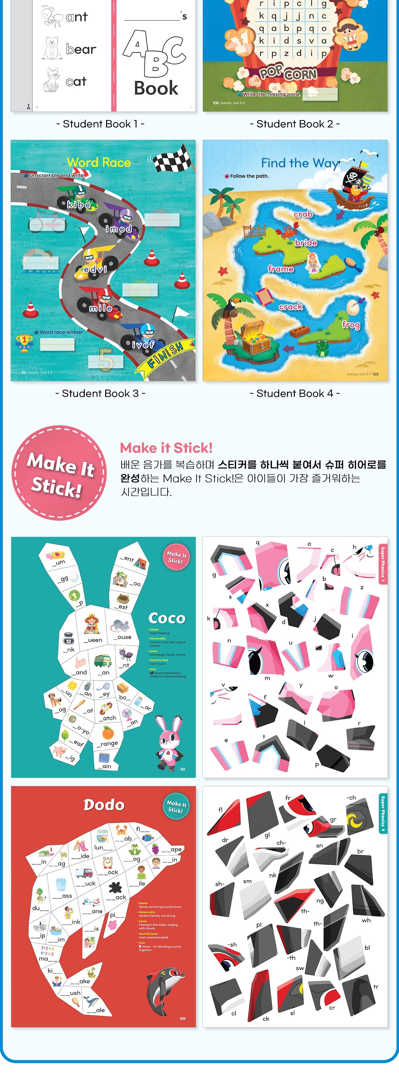 귀여운 슈퍼 히어로가 파닉스 여행을 함께하며 Make It Stick!활동까지 아이들을 안내합니다.